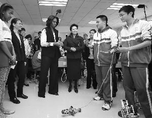在学校的博学楼前握手并合影留念后,彭丽媛和米歇尔一行来到工程技术实验室,参加几何机器人课程。这是北师大二附中的特色课程之一,涉及数学、机械和控制三个学科。米歇尔对机器人颇感兴趣,学生们向她介绍了一台名为“BAD BOY”(坏男孩)的机器人,并邀请她亲自用遥控器试一试。米歇尔按下遥控器,机器人却没动,学生们调侃说,“你看它就是很不听话,需要好好沟通。”在学生们的指导下,机器人终于“听话”了。