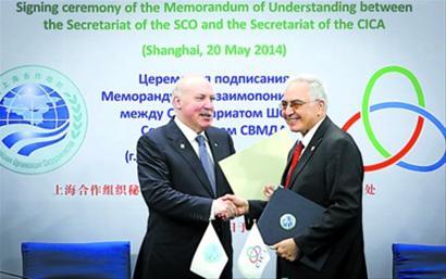 5月20日,亚洲相互协作与信任措施会议秘书处与上海合作组织秘书处在亚信第四次峰会新闻中心举行签署谅解备忘录仪式。 竺钢 摄
