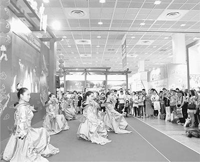 中韩两国一衣带水,文化交往源远流长。图为不久前在首尔举行的第二十九届韩国国际旅游展上,韩国参观者观看中国展台的舞蹈表演。