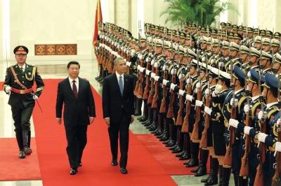 习近平主席在人民大会堂为奥巴马举行欢迎仪式。新华社发