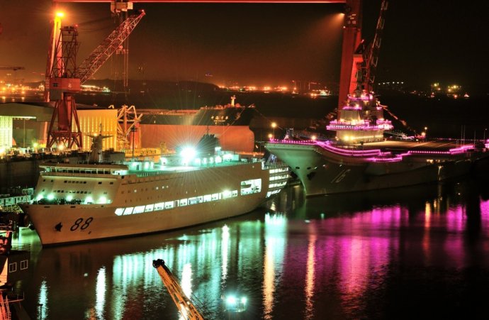 “辽宁舰”节日期间霓虹灯闪亮装点海湾 返回