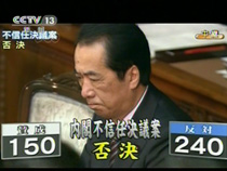 内阁不信任案遭否决 菅直人继续担任日首相
