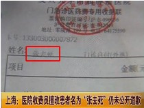 • 医院收费员擅改患者名为"张去死"尚未道歉