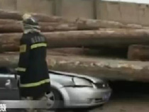 圆木压扁轿车 乘客竟无大碍