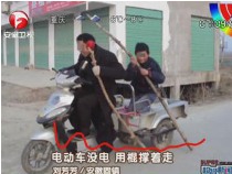 • 电动车没有电 二人拿棍撑着走
