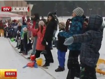 拉脱维亚儿童不畏严寒参加趣味扔雪球比赛