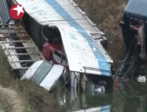 • 16辆全新轿车集体"泡澡" 半挂车失控栽池塘