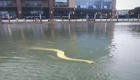 男子带宠物黄金蟒到公园人工湖游泳