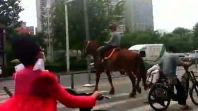 男子下班高峰骑马逛街引市民抓拍