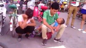 年轻夫妻抱男童街头乞讨 民警怒斥
