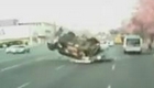 吉普失控翻转飞起 瞬间砸扁轿车