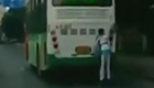 实拍小学生脚踩旱冰鞋手拉公交借力滑行