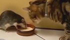实拍吃货小老鼠淡定和猫抢食