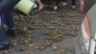 男子发现鸭子被冻湖面 跳湖破冰救援