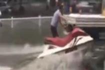 海口暴雨 市民街上骑摩托艇
