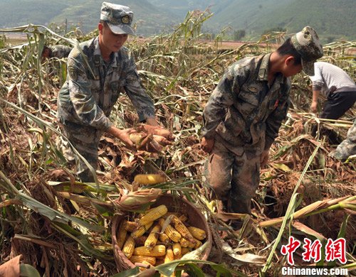 图为官兵正在帮助灾民抢收玉米。中新社发 刘忠俊 摄