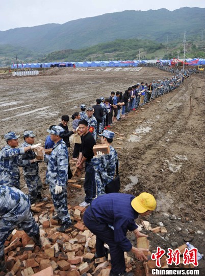 5月9日,四川芦山龙门乡遭遇震后最大的一场暴雨袭击,青龙场村集中安置点部分帐篷内出现积水,进安置点的道路泥泞不堪。为了让180户700余口村民住进能够遮风挡雨的帐篷,成都军区空军200余名官兵紧急出动,抢运红砖、砂石,排除积水,抢修排水设施。经过10多个小时的奋战,安置点244顶帐篷都铺上了红砖,通往安置点泥泞小路变成了宽敞的砂石路,村民们终于能安心地度过一个雨夜了。