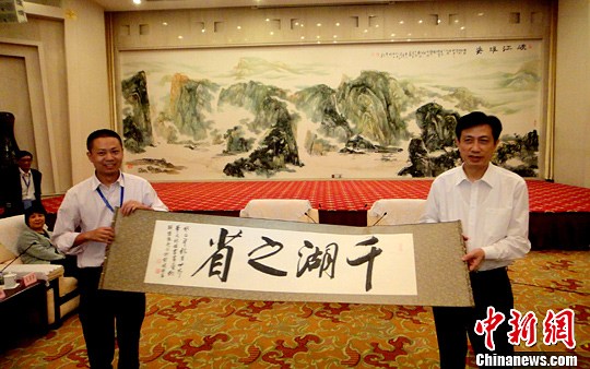 华文媒体高层赠送书法作品。艾启平 摄