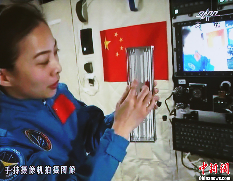 6月20日10时许,神舟十号航天员在天宫一号开展基础物理实验,为青少年进行中国首次太空授课。图为王亚平讲授质量测量。中新社发 秦宪安 摄