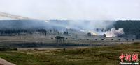 8月12日,“和平使命-2013”联合反恐军演中俄两军参演部队在切巴尔库尔合同训练场举行全员全要素实兵协同训练。双方共出动官兵近900人,坦克、步战车、直升机等武器装备约130台,双方导演部总导演——俄中部军区司令员波格诺夫斯基和沈阳军区副司令员石香元,共同到演习地观摩并指导两军训练。图为中方坦克战车对恐怖武装力量实施火力打击。中新社发 李祥辉 摄