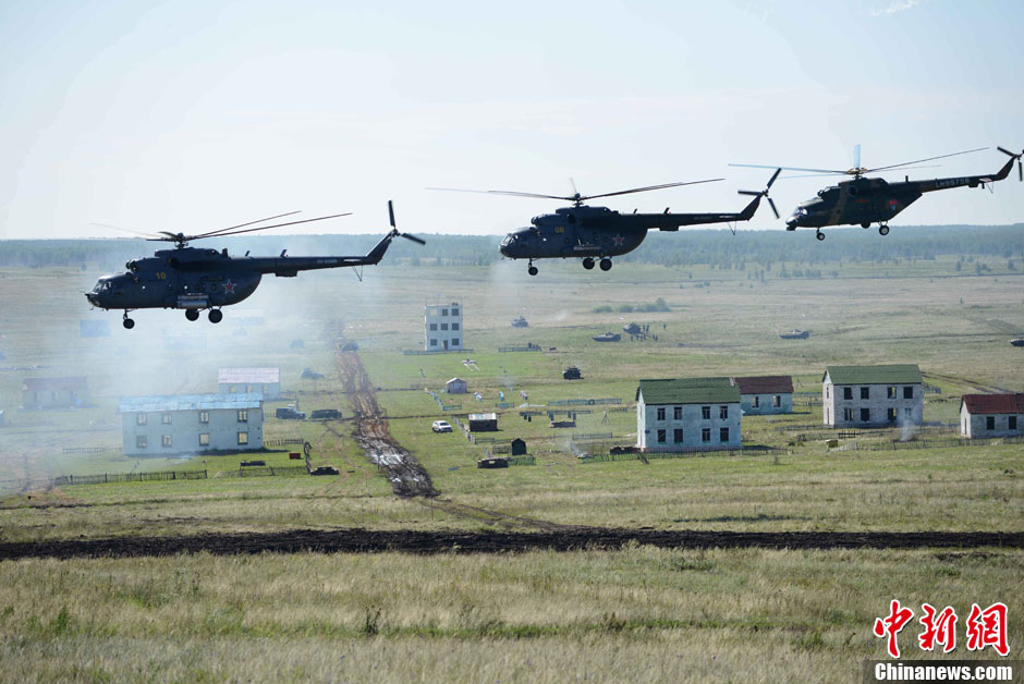 8月12日12时(北京时间下午2时),“和平使命-2013”中俄联合反恐军事演习,在俄罗斯切巴尔库尔合同训练场进行了实兵实弹协同训练。图为中方武装直升机发射干扰弹隐蔽接敌。中新社发 谭长俊 摄