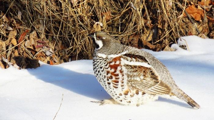 花尾榛鸡在雪中觅食。
